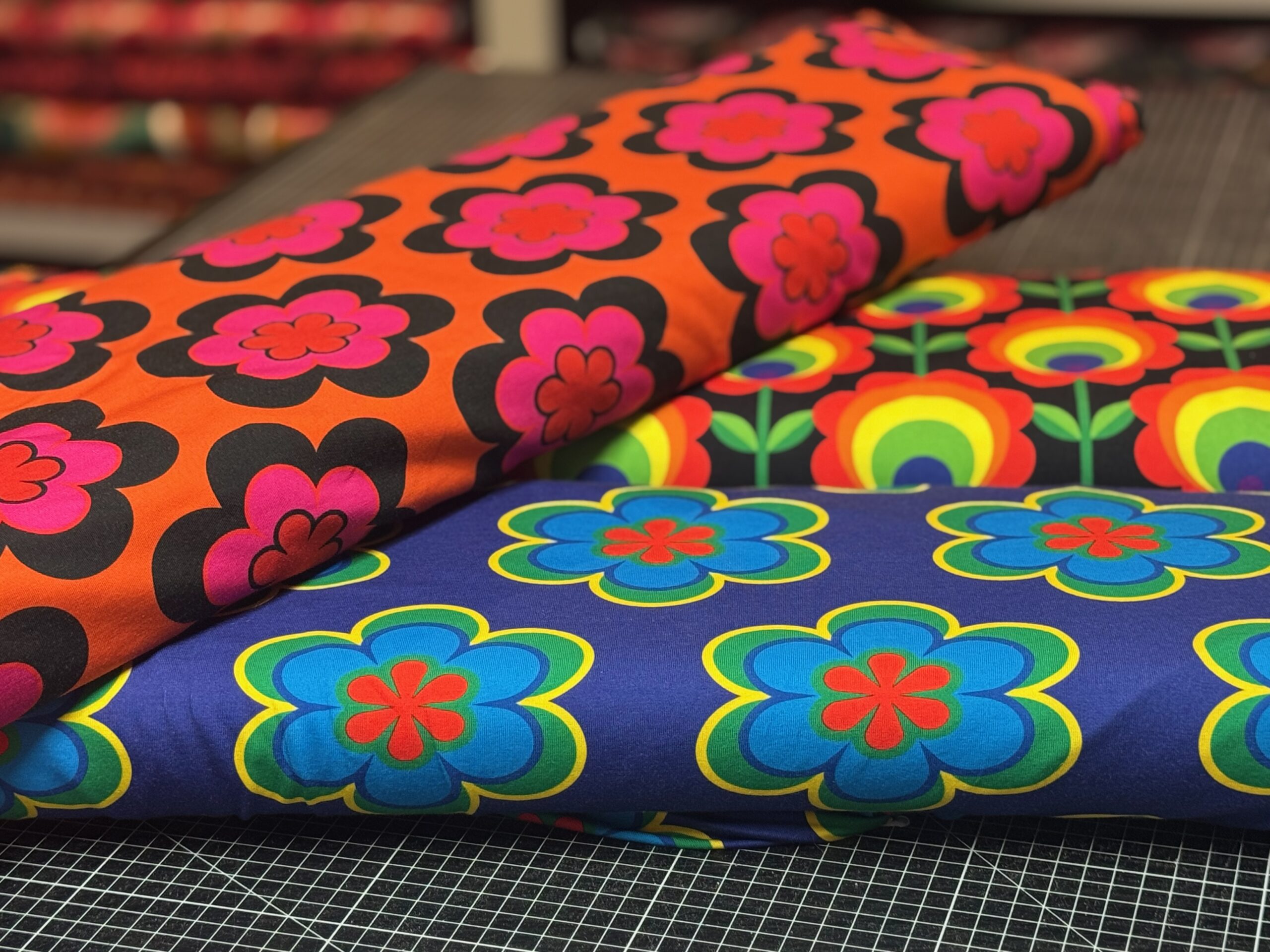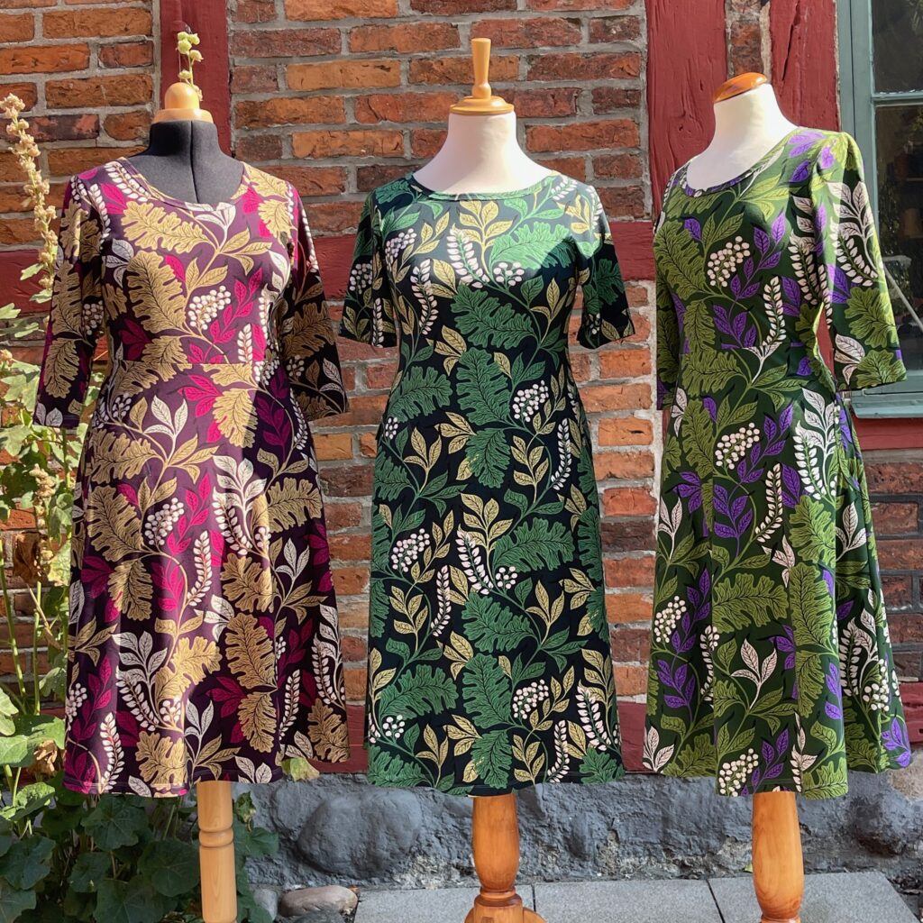 Vi har mängder med färgglada mönstrade tyger (och en del mer klassiska) i vår ateljé i Ystad. Har du möjlighet så boka gärna en tid med oss för konsultation. Vi kan även sy upp plagg av kundens eget tyg förutsatt att det kvalitetsmässigt fungerar till våra plagg.