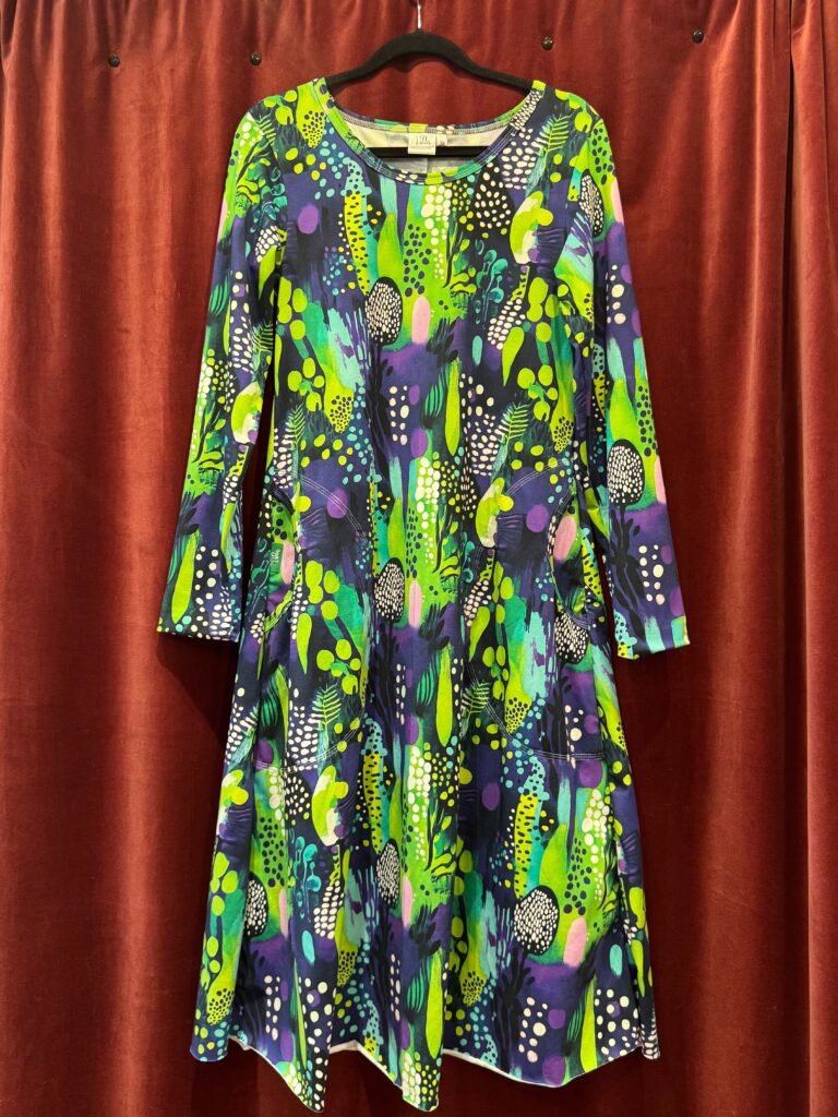 Ekologisk (GOTS) bomullsjersey med 5% elastan. Det köps bara in begränsat antal meter, och det går inte att säga exakt hur många klänningar som det blir eftersom det beror på vilka storlekar och längder som säljs.