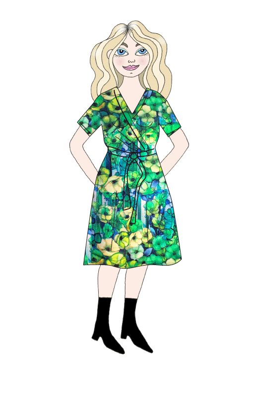 Modellbilderna visar klänningsmodellen i annat tyg. På första modellbilden (med 3/4 dels utställd ärm) visas stl 38/40, på nästa (bryggan) har modellen stå 36/38, och sen är det stl 46/48 (på den bilden är ärmen ofållad). Vi har valt att sy denna klänningen dubbelstorlekar eftersom modellen är flexibel. Väljer du mellan två storlekar så rekommenderar vi den större eller ännu hellre prata med oss så hjälper vi dig att välja. Skärpet är löst utan hällor och kan knytas över sömmen, i håret eller kanske på väskan?
