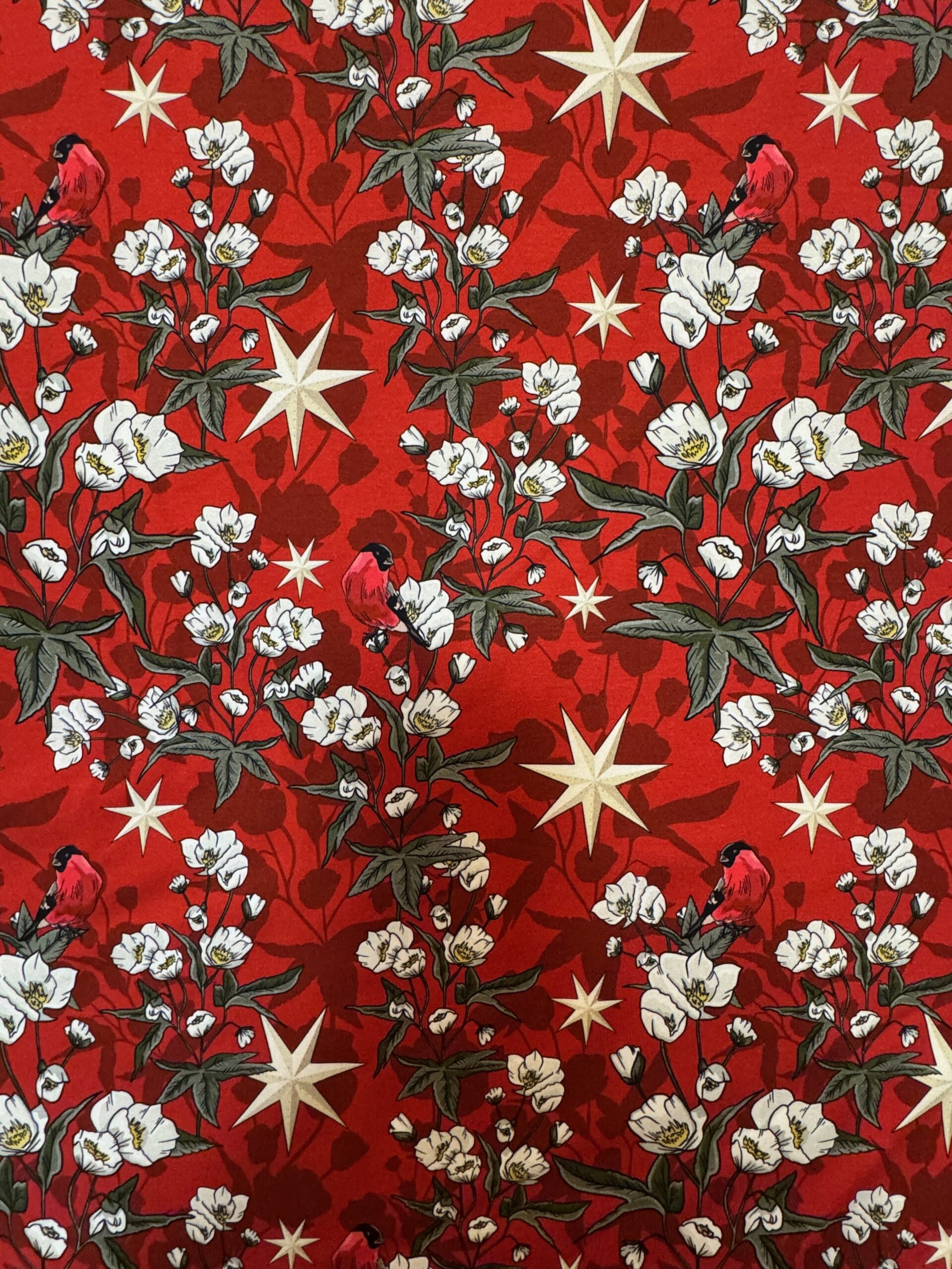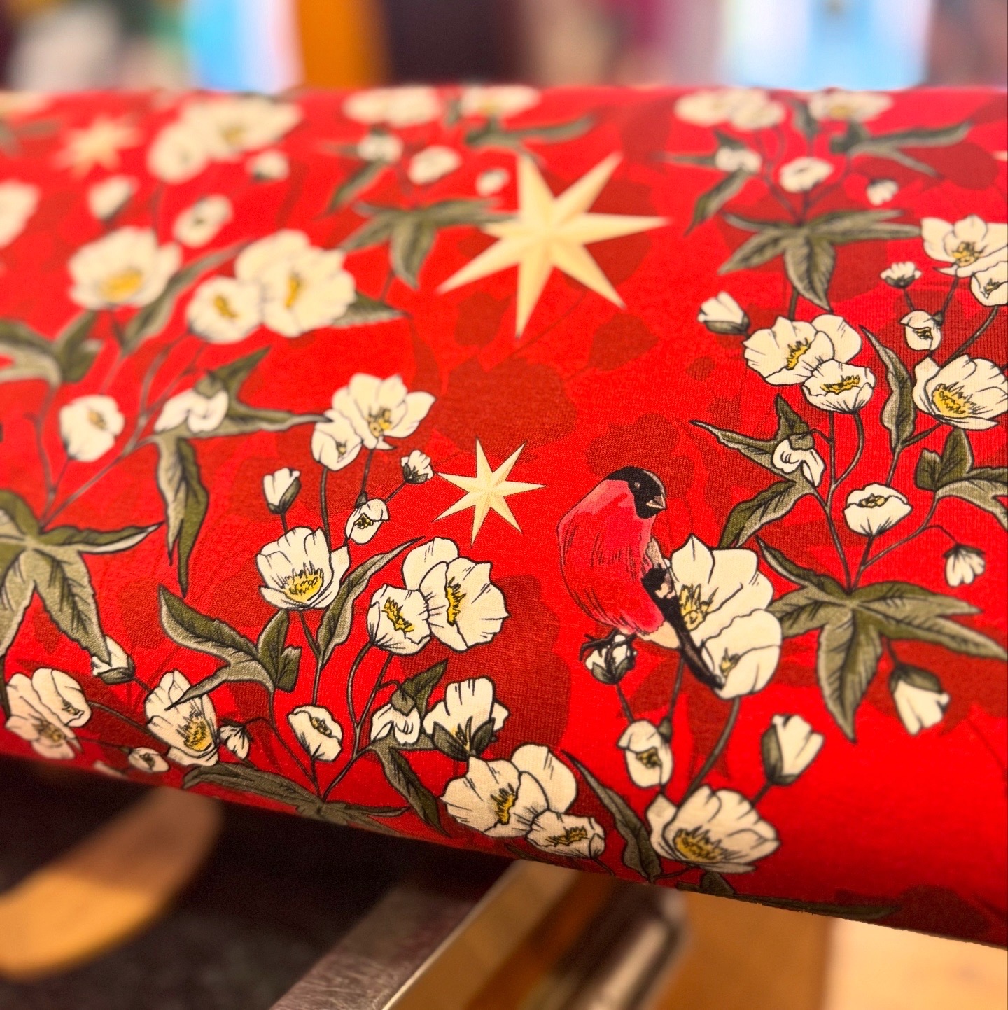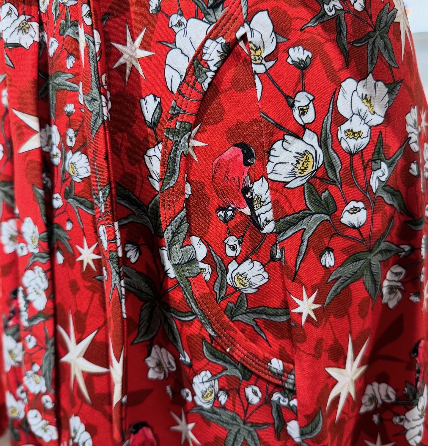 Material: Trikåtyg designat och tryckt i Europa. ekologiskt GOTS, 95% bomull och 5% elastan. Halsrigning och  ev fickor kantas med kantband i samma mönster som klänningen. Ärmsluten har inga kantband utan fållas som nedankanten av klänningen (söm).