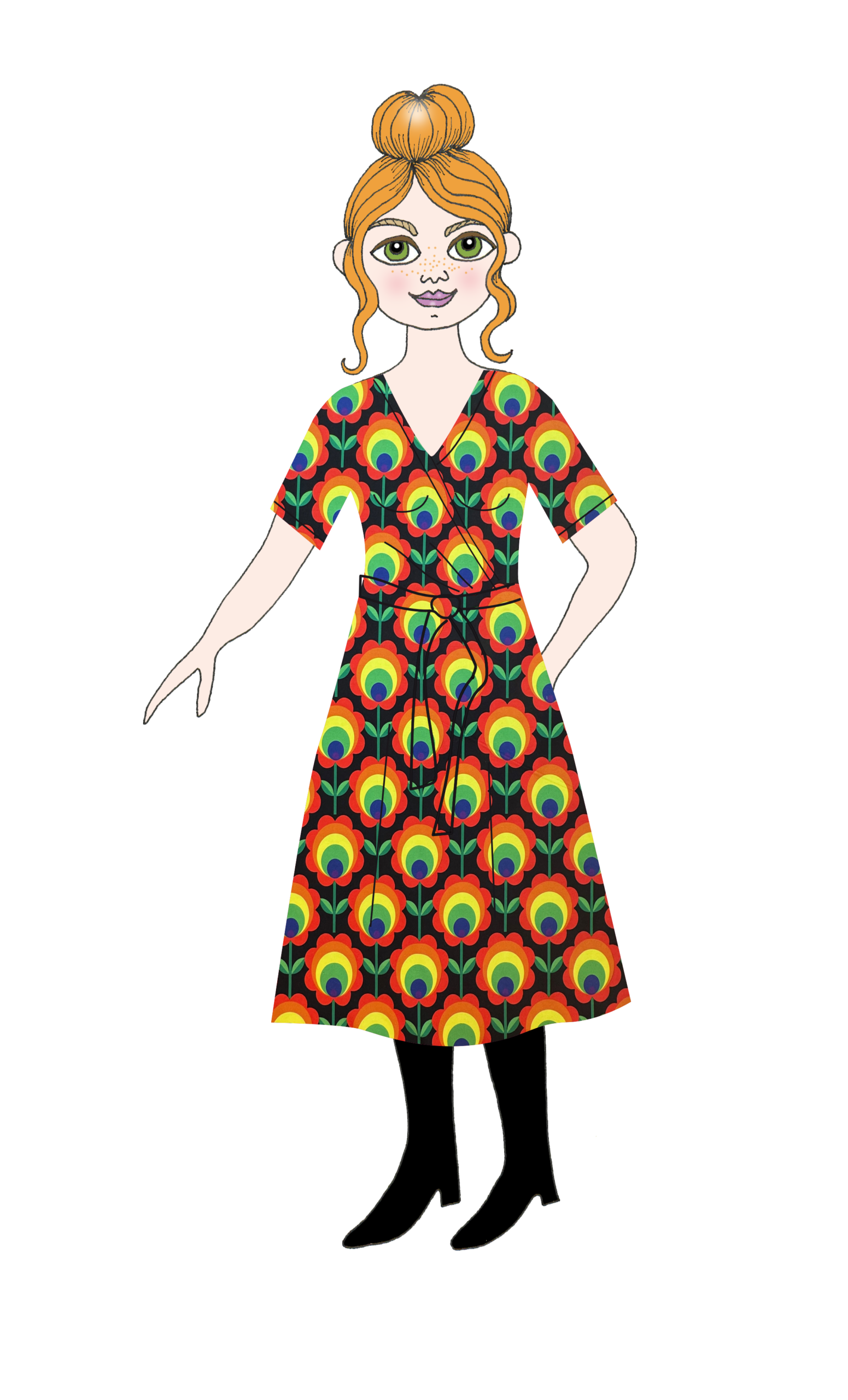 Vi har valt att sy denna klänningen dubbelstorlekar eftersom modellen är flexibel. Väljer du mellan två storlekar så rekommenderar vi den större eller ännu hellre prata med oss så hjälper vi dig att välja. Skärpet är löst utan hällor och kan knytas över sömmen, i håret eller kanske på väskan?