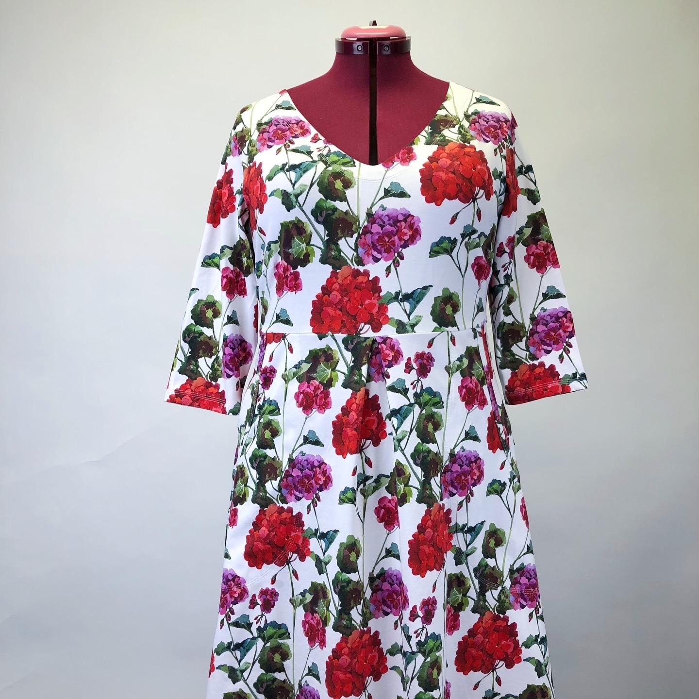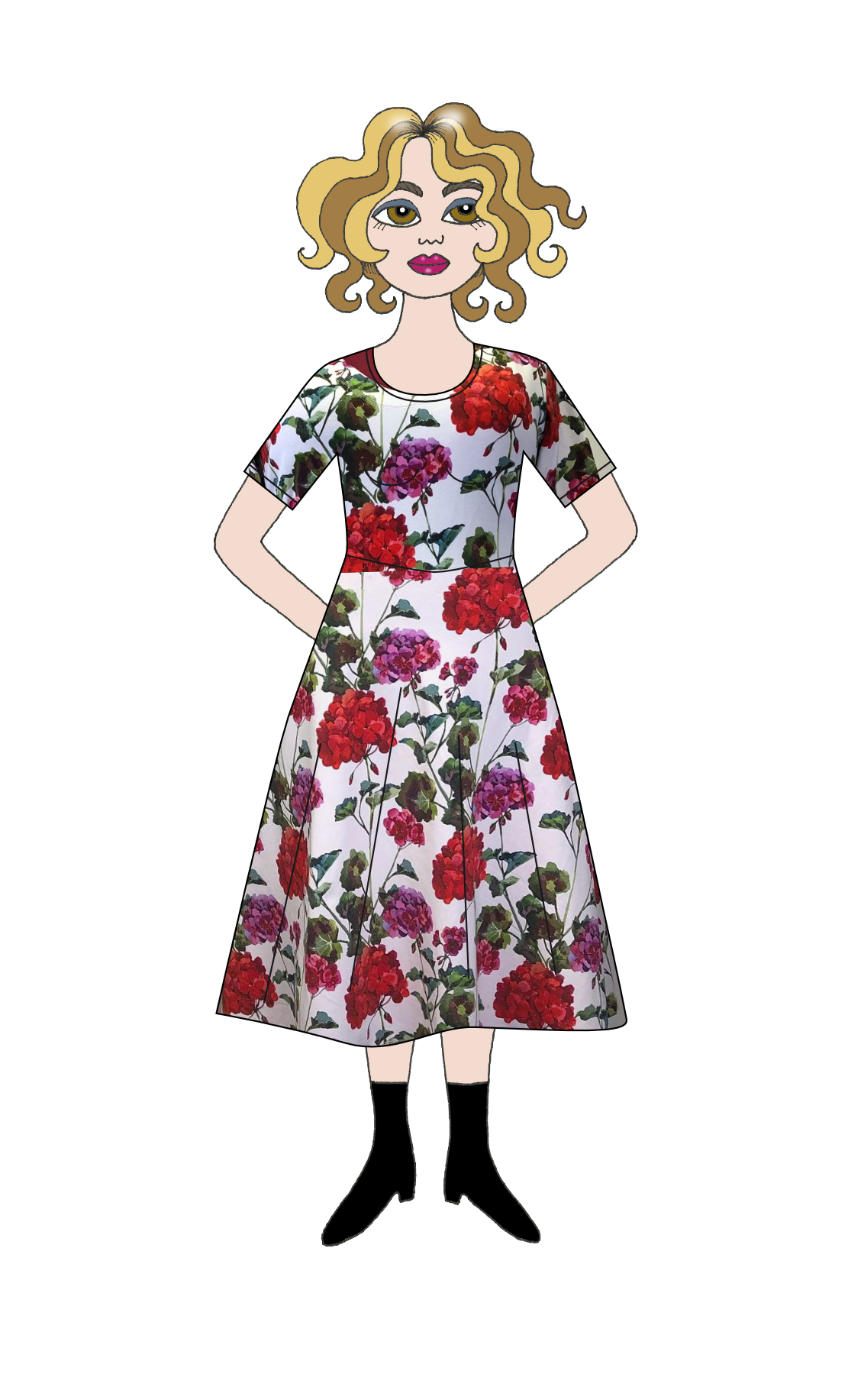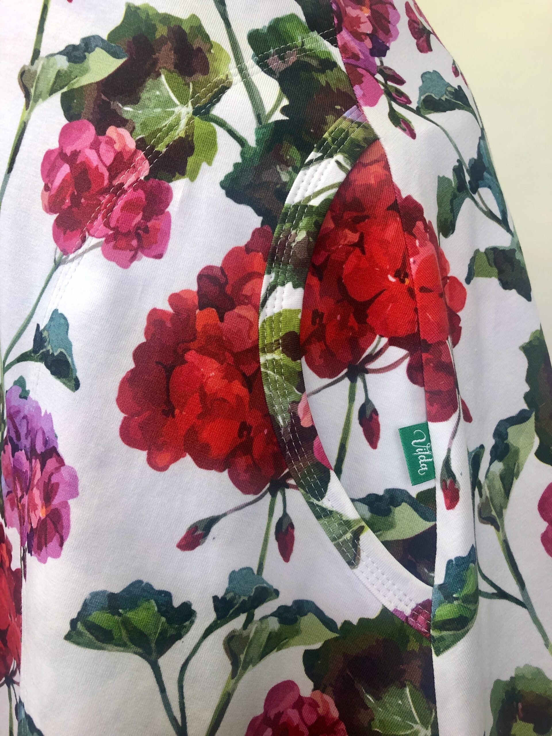 Brita i tyg Pelargon har åtsittande liv och klockad kjol, vilket ger en klassisk klänningsmodell och fin silhuett. Fickor eller knytskärp går att lägga till mot pristillägg (200:-) Väljer du fickor sys dessa mot framstycket för att ligga fint mot höften utan att bli klumpiga.