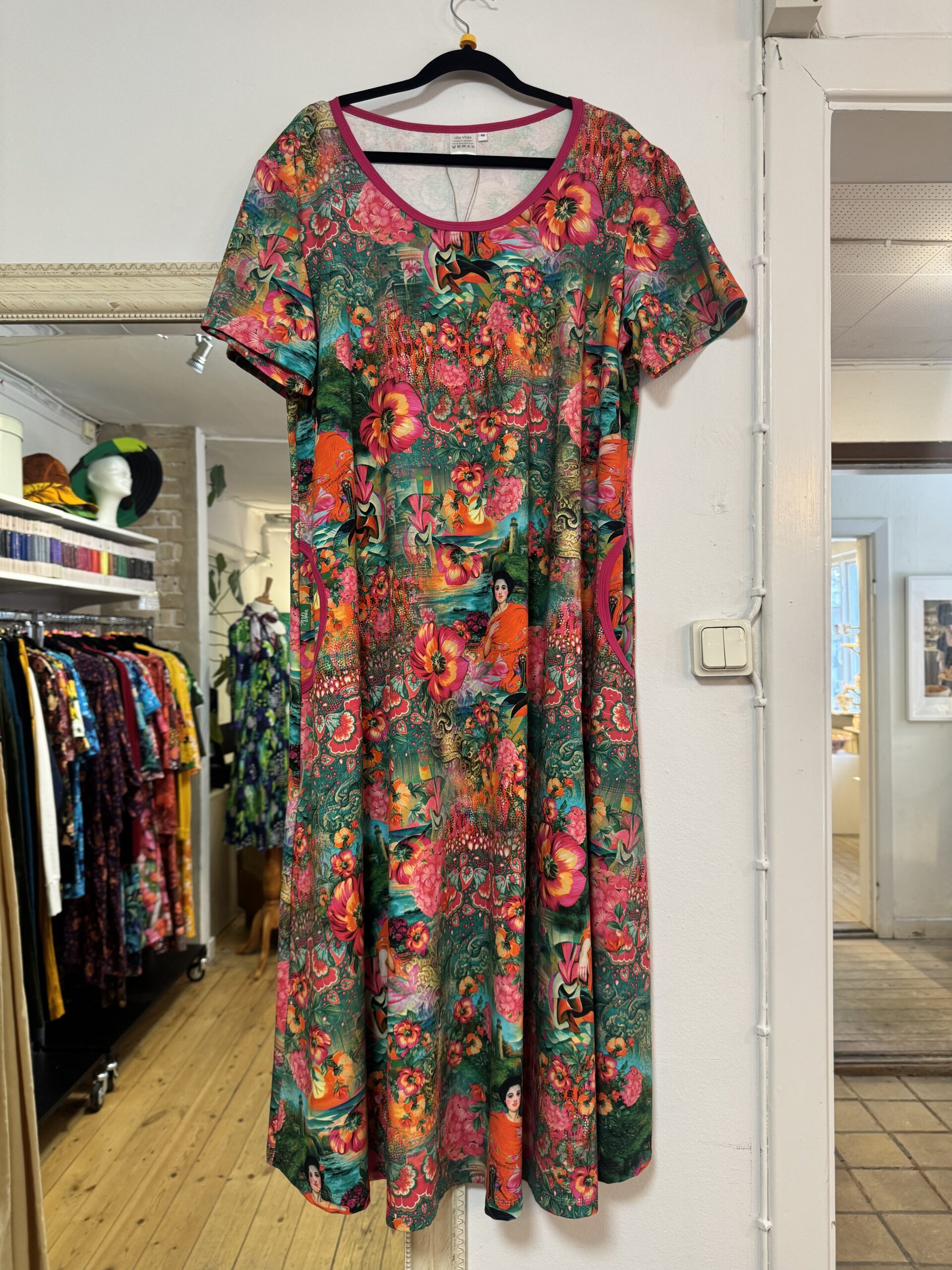Färgglad klänning / trikåklänning sydd i storlek 48 men i modell Jenny går de flesta kunder upp i storlek så motsvarar i andra märken storlek 46/48.