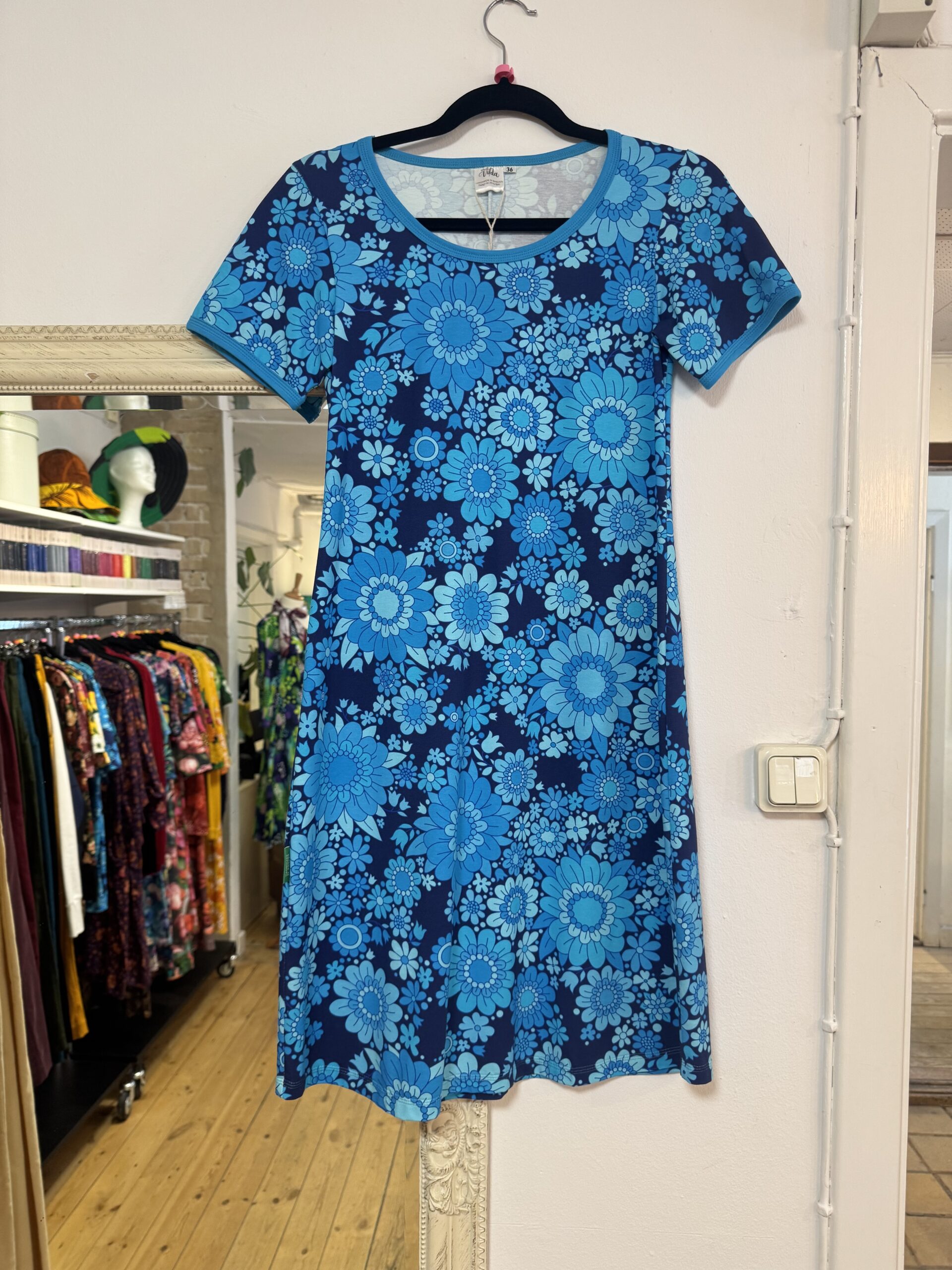 Vår populära modell jenny, fast här med rak kjol, dvs inte alinje. Underbar ekologisk blå blommig bomullstrikå med mycket stretch. Klänningsmodellen är liten i storleken.