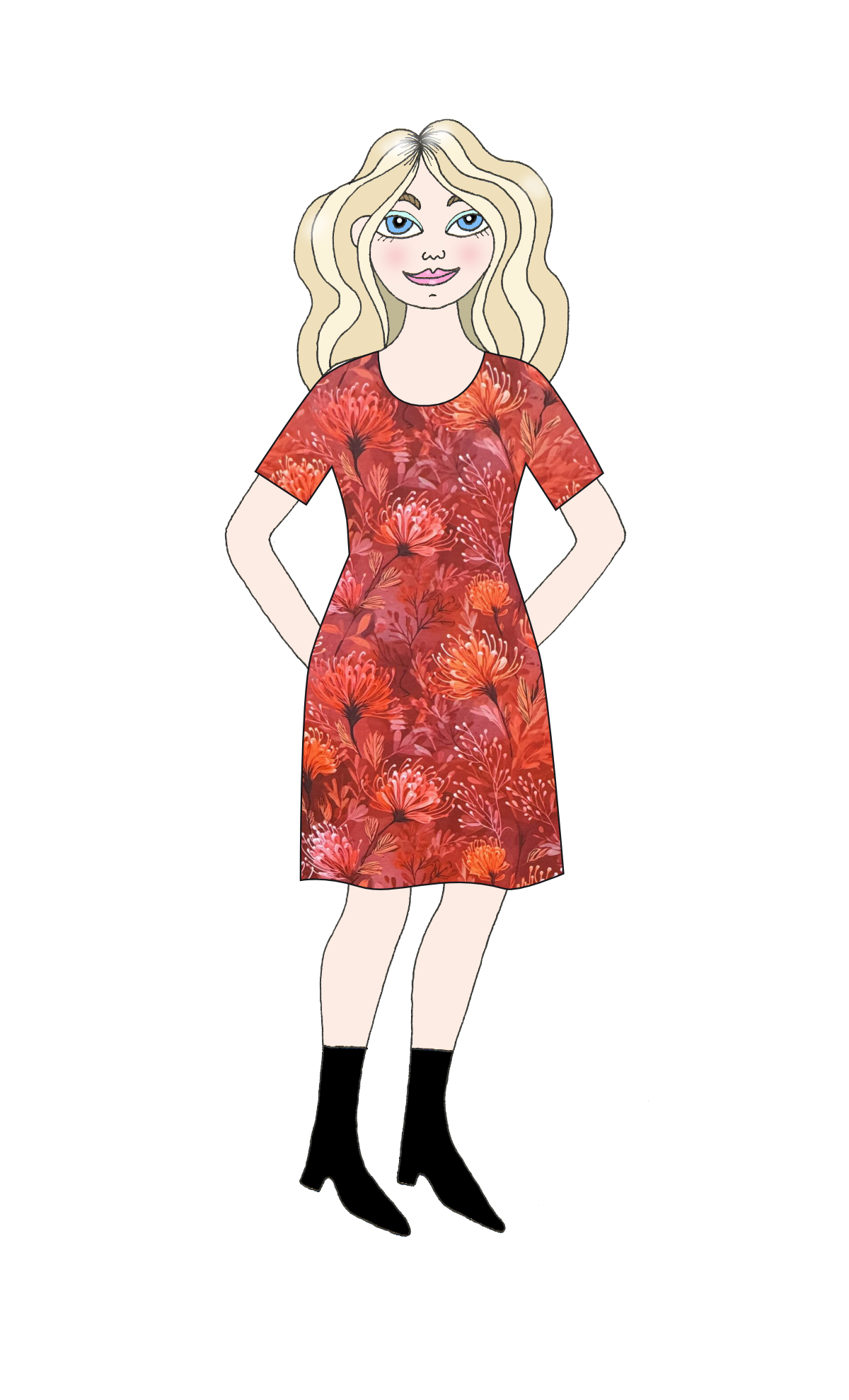 Grundpriset avser en knälång kortärmad klänning cirka 100 cm lång från axeln och ner. Fickor eller knytskärp går att lägga till mot pristillägg (200:-) Önskas en klänning med rakare kjoldel hör av dig så fixar vi detta! Den här modellen passar de flesta kroppstyper. Den är lätt utställd med helt framstycke utan tvärgående söm vid midjan. Omtyckt som vardagsklänning, men passar förstås fint till fest med. Väljer du fickor sys dessa mot framstycket för att ligga fint mot höften utan att bli klumpiga.