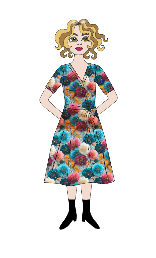 Vid bysten är modellen flexibel. Vid delningsömmen under omlottlivet är klänningen tänkt att sitta åt.