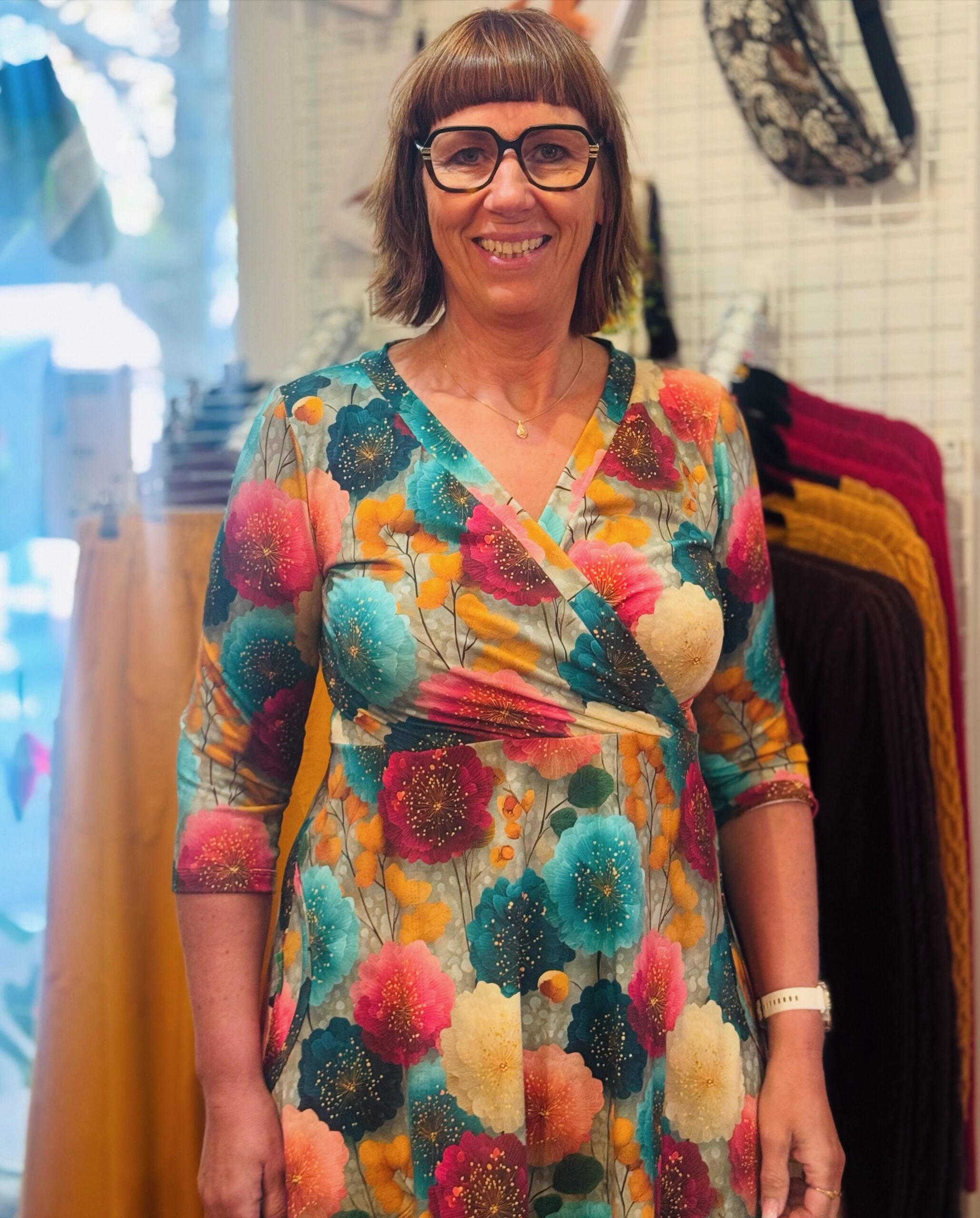 Modellbilderna visar klänningsmodellen i annat tyg. På första modellbilden (med 3/4 dels utställd ärm) visas stl 38/40, på nästa (bryggan) har modellen stå 36/38, och sen är det stl 46/48 (på den bilden är ärmen ofållad). Vi har valt att sy denna klänningen dubbelstorlekar eftersom modellen är flexibel. Väljer du mellan två storlekar så rekommenderar vi den större eller ännu hellre prata med oss så hjälper vi dig att välja. Skärpet är löst utan hällor och kan knytas över sömmen, i håret eller kanske på väskan?