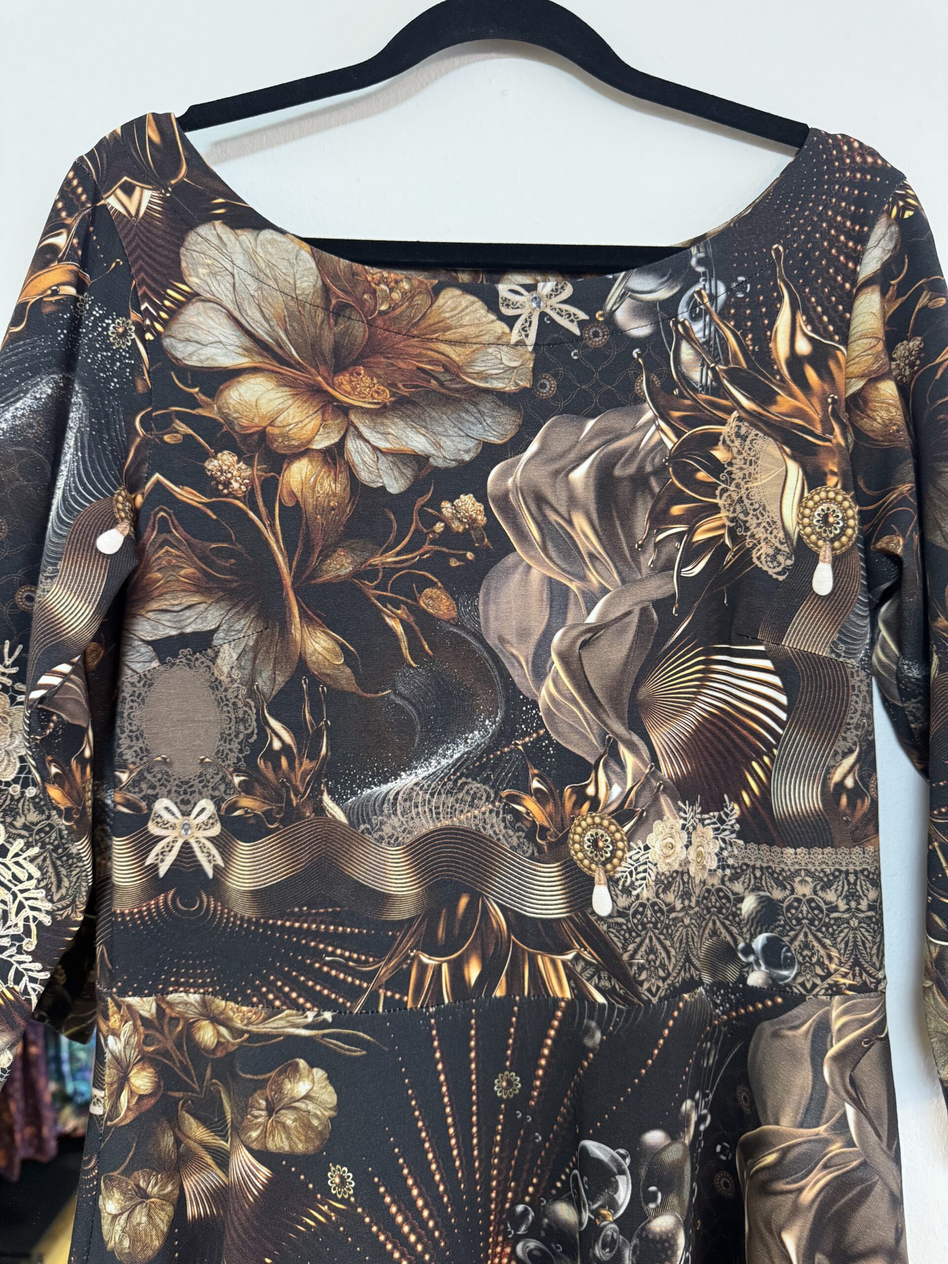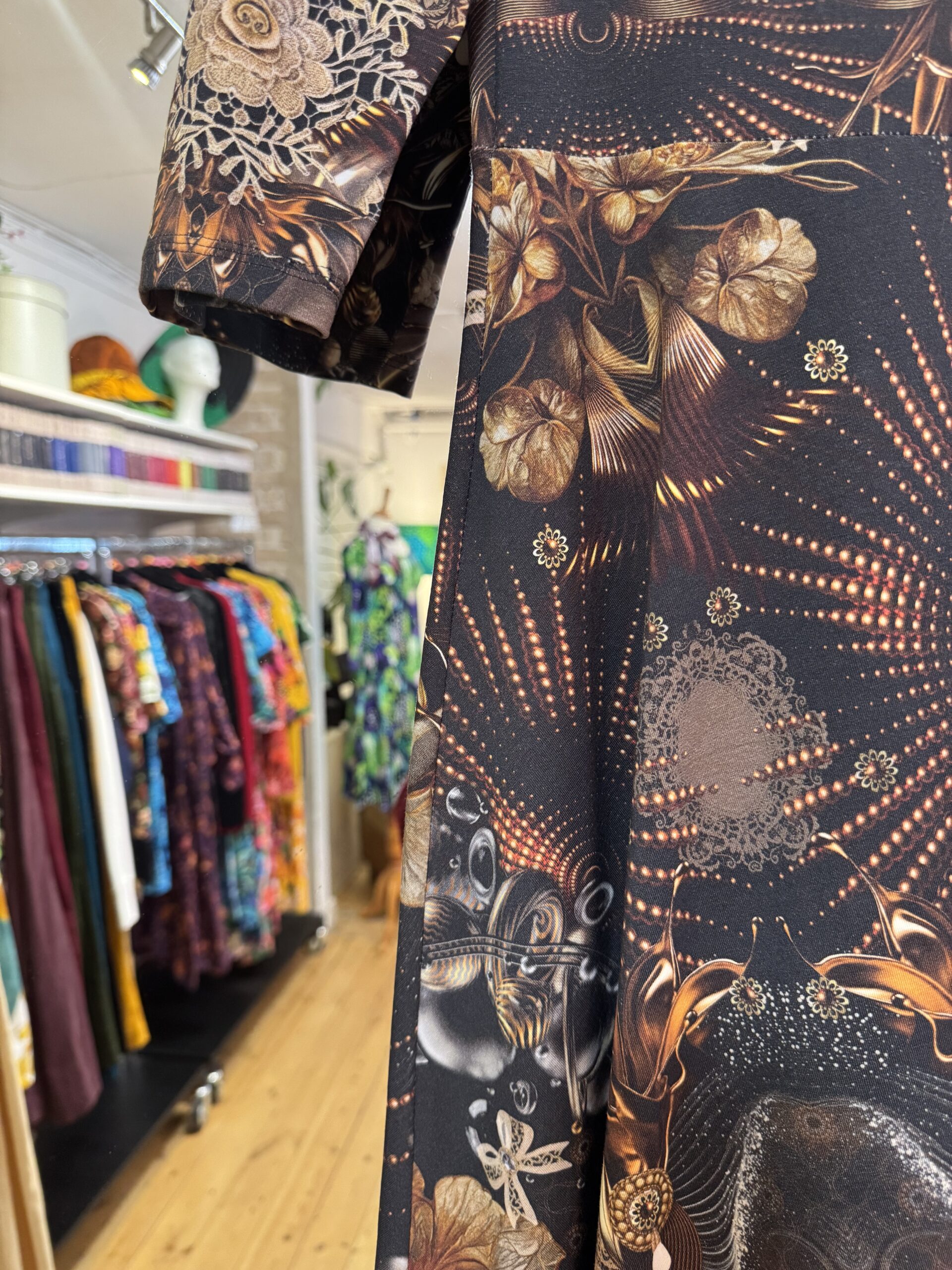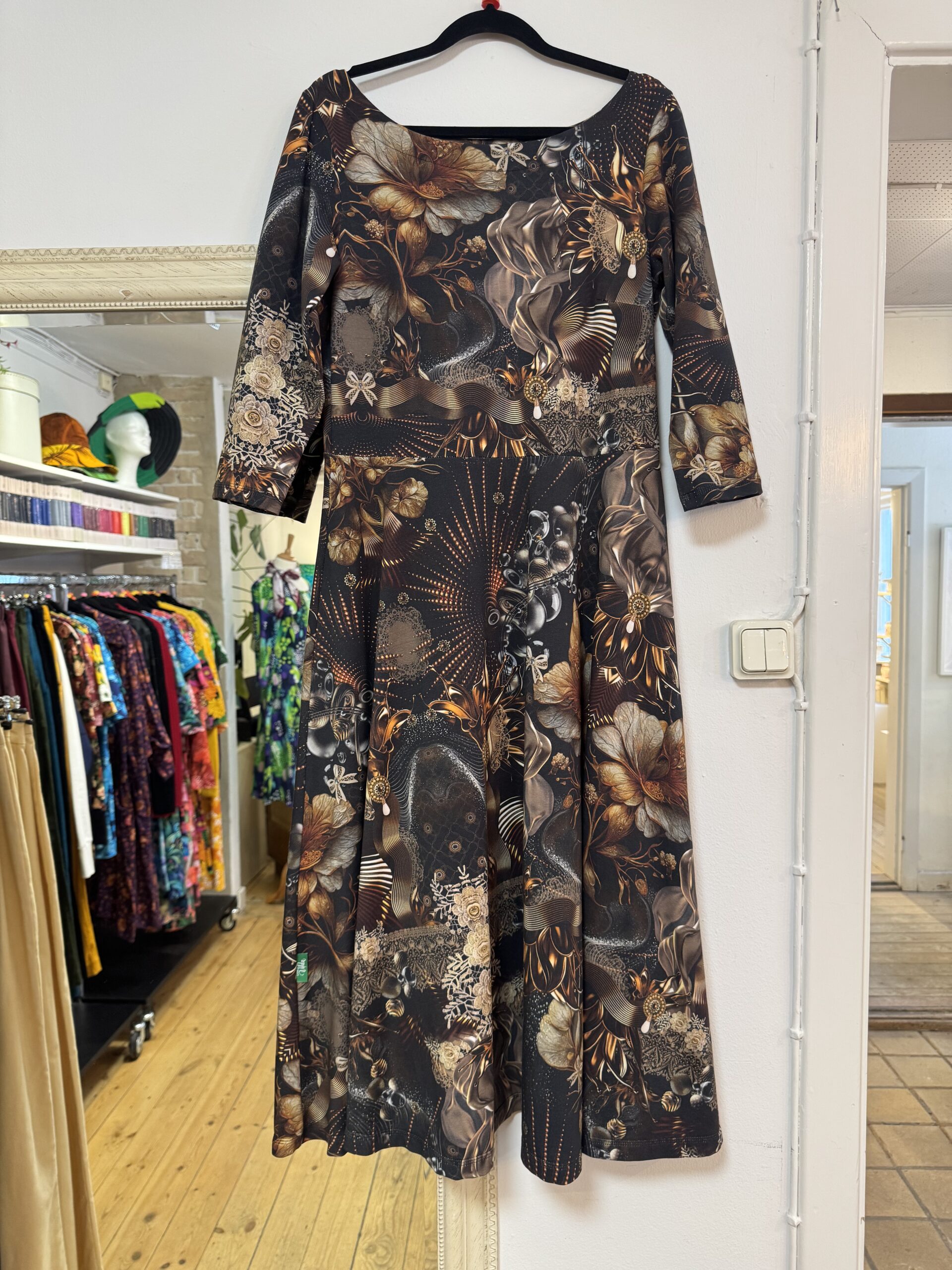 Härlig vidd i kjolen har vår klänningsmodell Saga. Åtsittande liv och 3/4 dels ärm.
