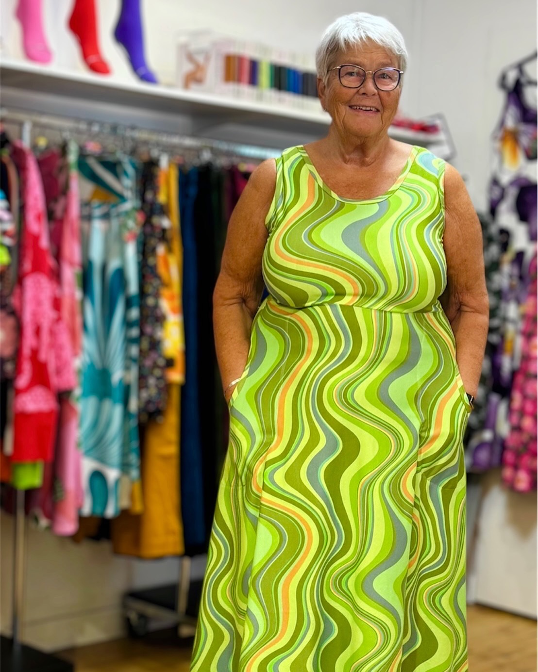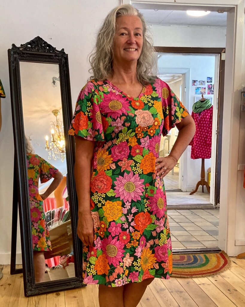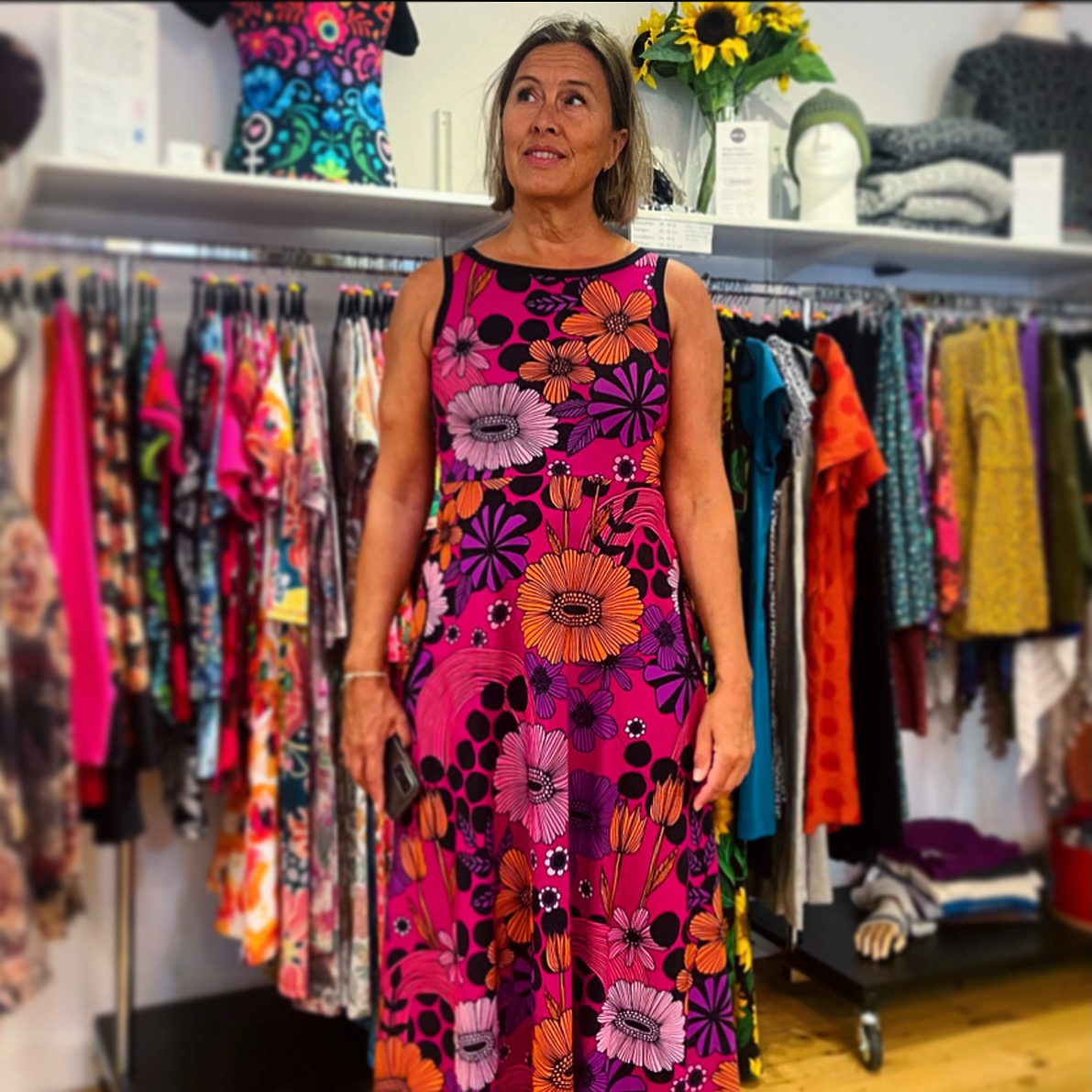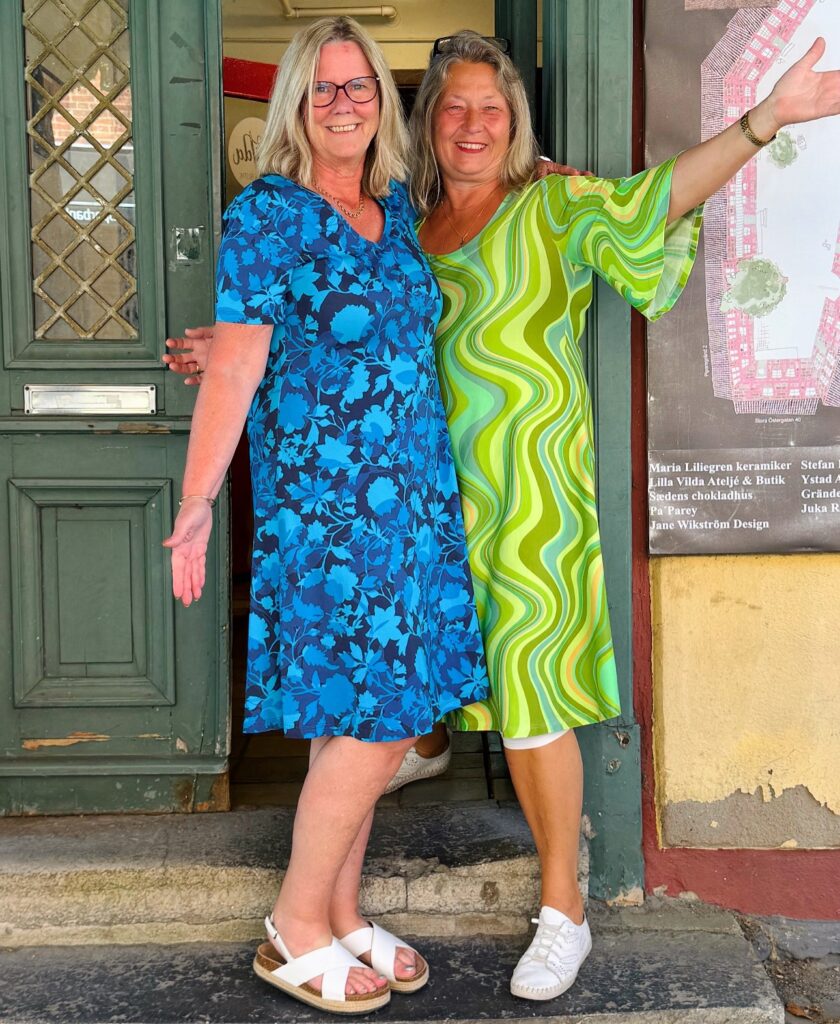 Våra färgglada plagg designas och sys i Sverige. Alla klänningar sys i vår egen syateljé i Ystad. Vi säljer färdigsydda plagg i vår egen butik samt via sociala medier. Varje månad (ej maj-aug) tar vi i mån av tid ett mycket begränsat antal beställningar, då främst som förhandsbokningar.